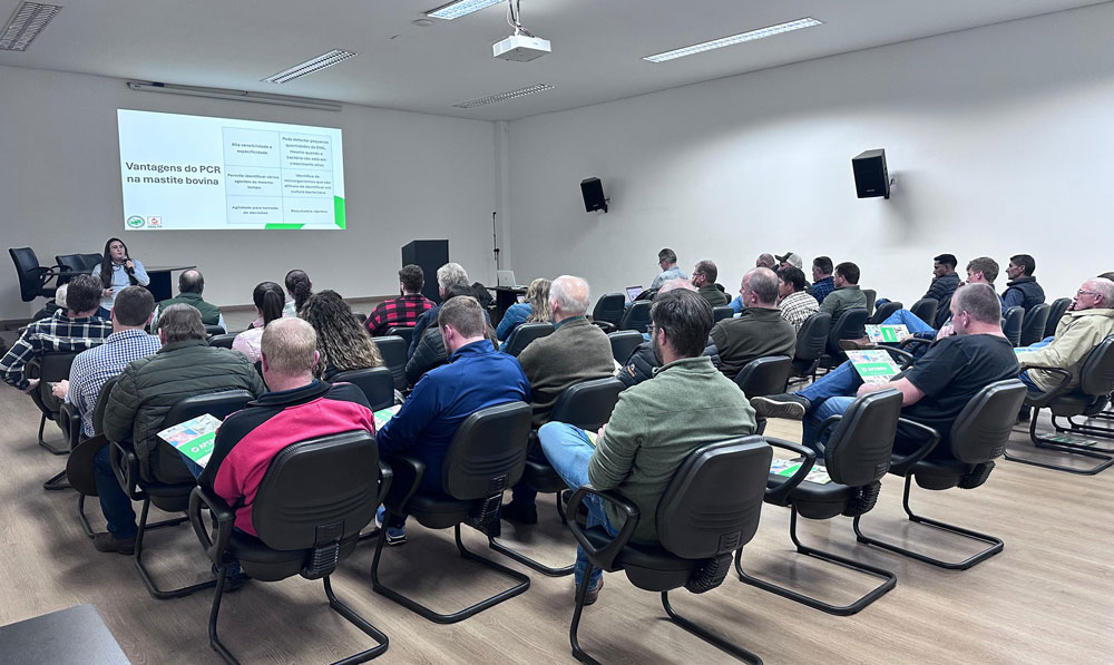 Antes da palestra principal, a Médica Veterinária Mylena Prado, representante da APCBRH, apresentou a nova ferramenta de diagnóstico PCR – Mastite e BVD, que oferece resultados rápidos e precisos para o controle sanitário dos rebanhos. Essa inovação reforça o compromisso da APCBRH com a saúde animal e a sustentabilidade da pecuária leiteira, facilitando o trabalho dos técnicos e produtores no campo.
