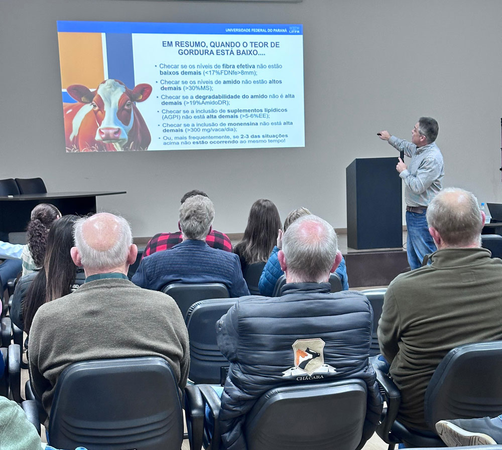 No dia 09 de outubro, em Arapoti (PR), produtores e técnicos participaram de um importante evento técnico promovido pela Capal Cooperativa Agroindustrial, em parceria com a APCBRH – Associação Paranaense dos Criadores da Raça Holandesa. O encontro contou com a presença do professor Dr. Rodrigo de Almeida, que ministrou a palestra “Novas análises de ácidos graxos no leite: como interpretar?”, abordando aplicações práticas dessa tecnologia na nutrição de vacas leiteiras.