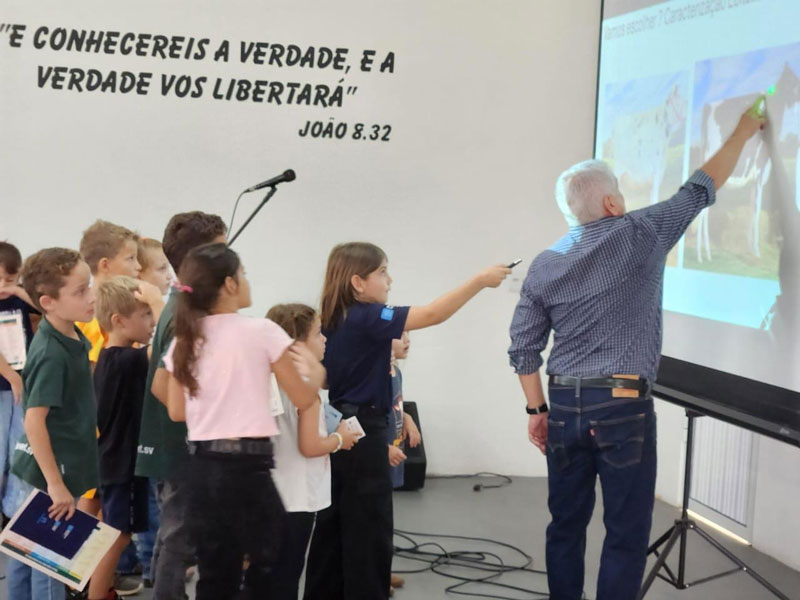 O jurado e Superintendente Técnico da APCBRH Dr. Altair Antônio Valloto recebeu o convite da Cooperativa Castrolanda para ministrar um curso de como selecionar gado jovem para exposição. Esse foi o primeiro encontro do Clube de Bezerras 2025 e contou com a participação de mais de 35 crianças. Elas participam de três encontros e, ao final, se apresentam com a bezerra que cuidaram desde pequena na pista de julgamento do Agroleite.