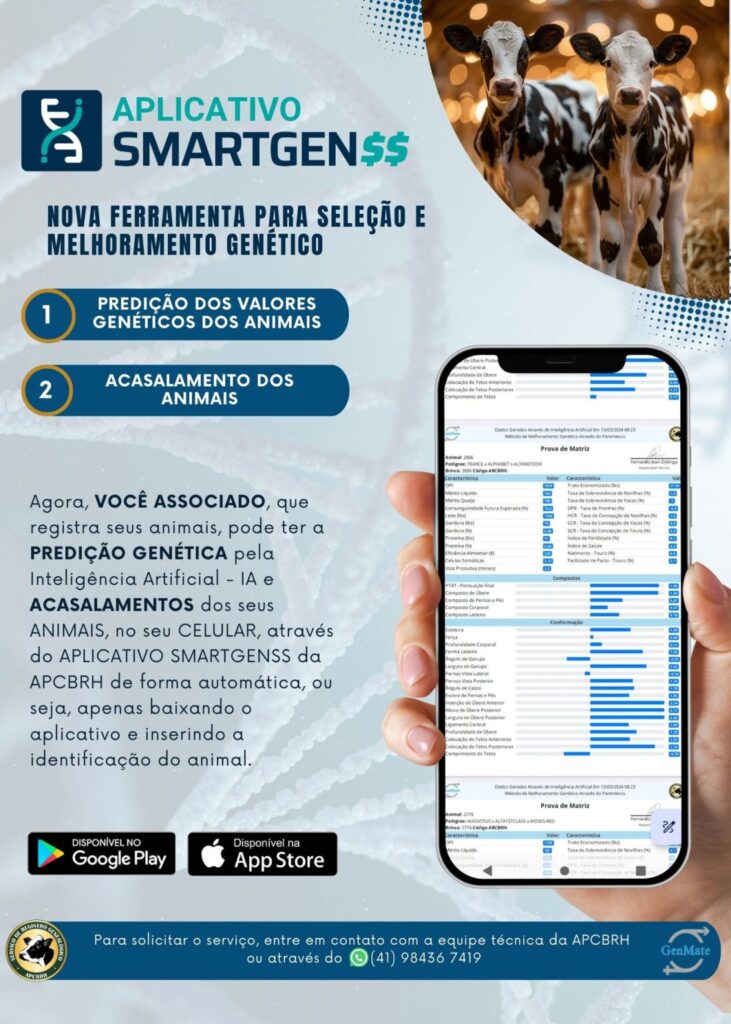 A predição pelo SmartGen (IA) está transformando a cadeia produtiva leiteira ao oferecer uma maneira precisa, eficiente a um custo muito barato para selecionar os animais desde bezerras  com alto potencial produtivo, reprodutivo e de conformação. Para os Associados da APCBRH, a partir de 2025, todo animal registrado e com pedigree terão gratuitamente está opção basta você aderir que tem interesse em receber estes resultados, fale com nossa equipe técnica ou com qualquer canal de comunicação da Associação. Você que deseja se manter competitivo, a incorporação da predição genética no manejo do rebanho já não é mais uma opção, mas uma necessidade.