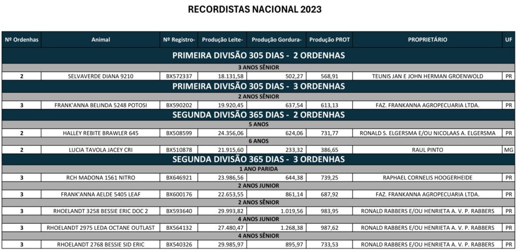 A premiação Recordista Nacional é ansiosamente esperada pelo mercado do leite. Dentro dos rebanhos de todo o Brasil, os associados paranaenses acabam de confirmar que possuem as vacas com a maior produção de leite no país no ano de 2023. No total foram premiadas nove fêmeas de seis produtores, sendo que cinco são do Estado do Paraná, sendo os ganhadores Fazenda Frankanna Agropecuaria Ltda, Raphael Cornelis Hoogerheide, Ronald Rabbers E/Ou Henrieta A. V. P. Rabbers, Ronald S. Elgersma E/Ou Nicolaas A. Elgersma e Teunis Jan e John Herman Groenwold.
