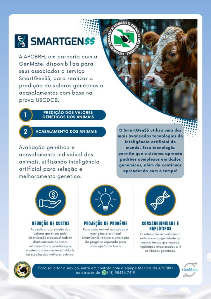 Para obter esta vantagem e saber quais são seus animais superiores e inferiores pela avaliação genética utilizando a Inteligência Artificial – IA, basta o associado aderir ao programa, envidando a seguinte mensagem: “EU QUERO PARTICIPAR DO PROGRAMA DE AVALIAÇÃO GENÉTICA PEL0 SMARTGEN$$” para o Whatsapp 41 98436-7419, ou fale com um dos nossos técnicos.