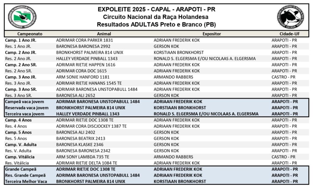 A cidade de Arapoti–PR foi palco, entre os dias 2 e 5 de julho, da 51ª edição da Expoleite, uma das principais exposições do Circuito Nacional da Raça Holandesa (CNRH) no país. Promovida pela Capal Cooperativa Agroindustrial, a feira foi realizada no Parque de Exposições Capal, reunindo o que há de melhor na genética da raça Holandesa e consolidando, mais uma vez, a força da pecuária leiteira estadual e nacional.