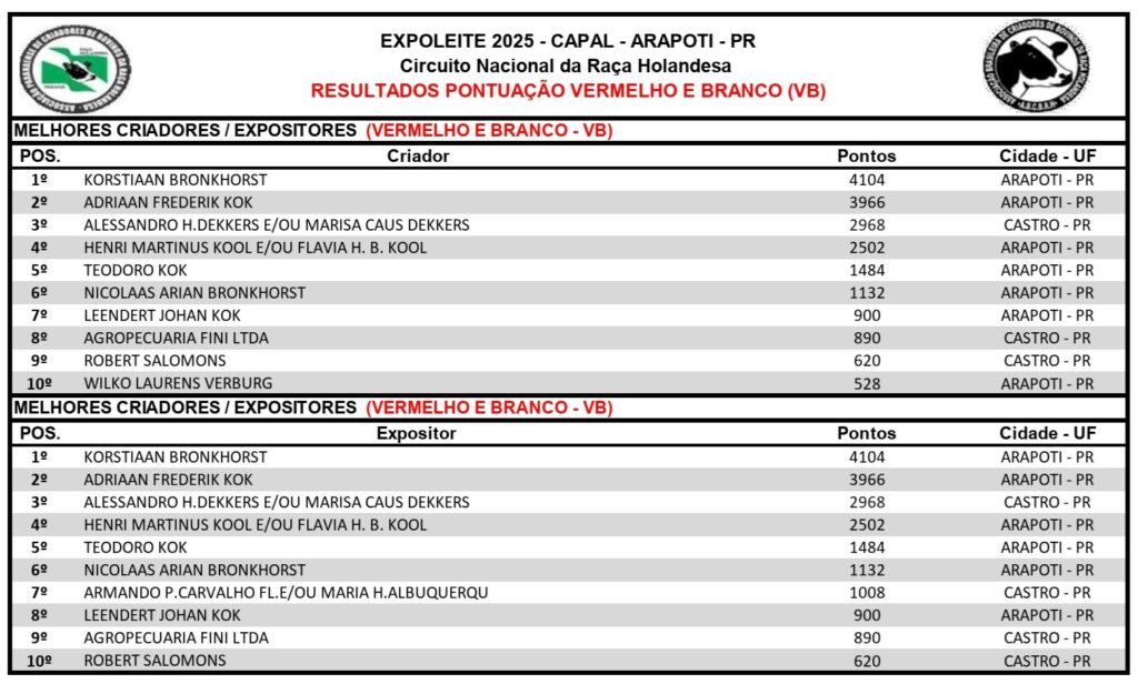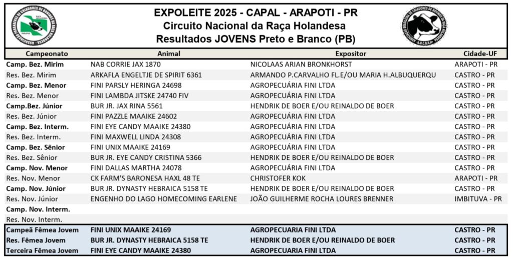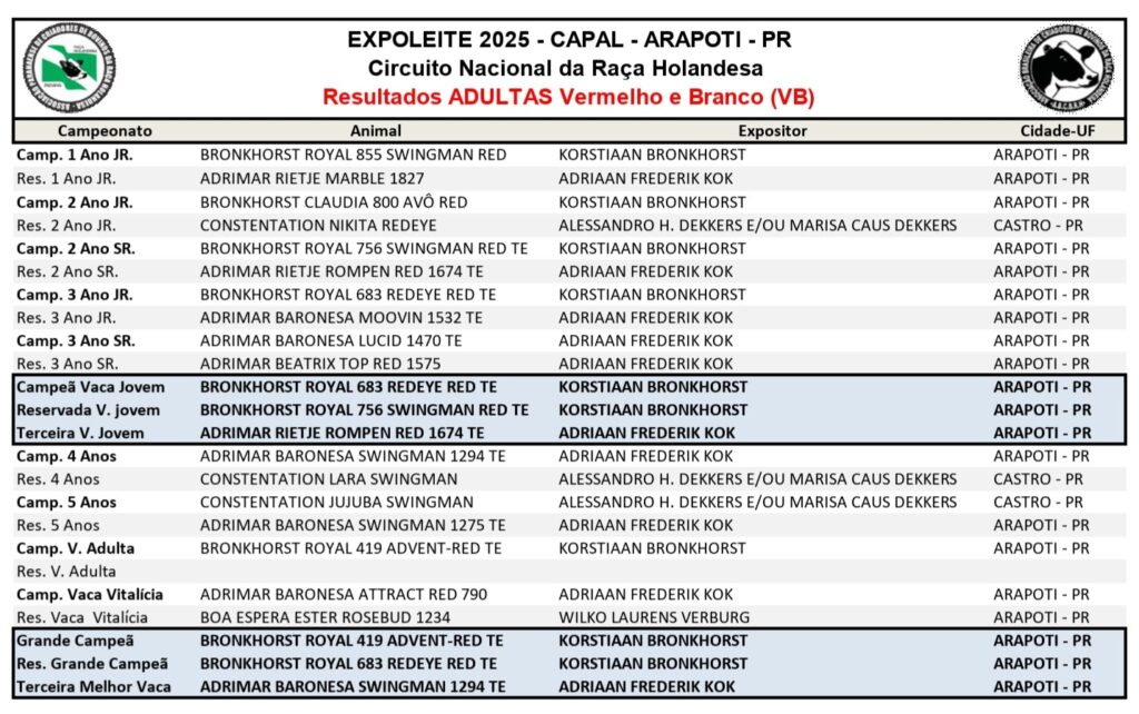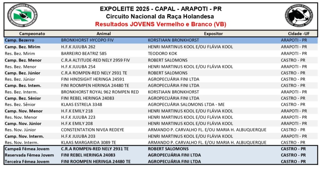 Expoleite 2025 reforçou o compromisso dos produtores com a excelência genética e o aprimoramento técnico da pecuária leiteira. A APCBRH, por meio de sua Diretoria e Conselhos (Fiscal e Técnico), parabeniza todos os criadores e expositores, bem como a Cooperativa Capal pelos resultados alcançados e pela dedicação em apresentar animais de alta qualidade — fundamentais para o desenvolvimento sustentável do setor leiteiro no Brasil.