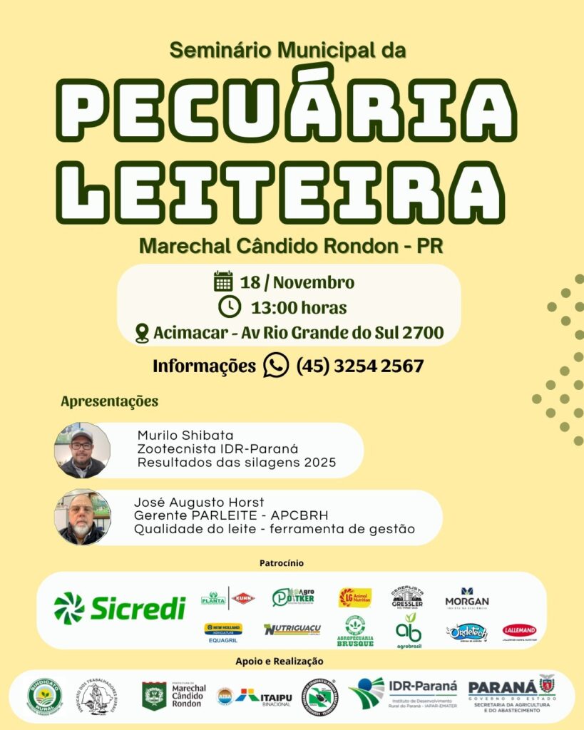 A Prefeitura de Marechal Cândido Rondon, em parceria com o Instituto de Desenvolvimento Rural do Paraná (IDR-Paraná) e diversas entidades do setor, promove no dia 18 de novembro, a partir das 13h, o Seminário Municipal da Pecuária Leiteira.